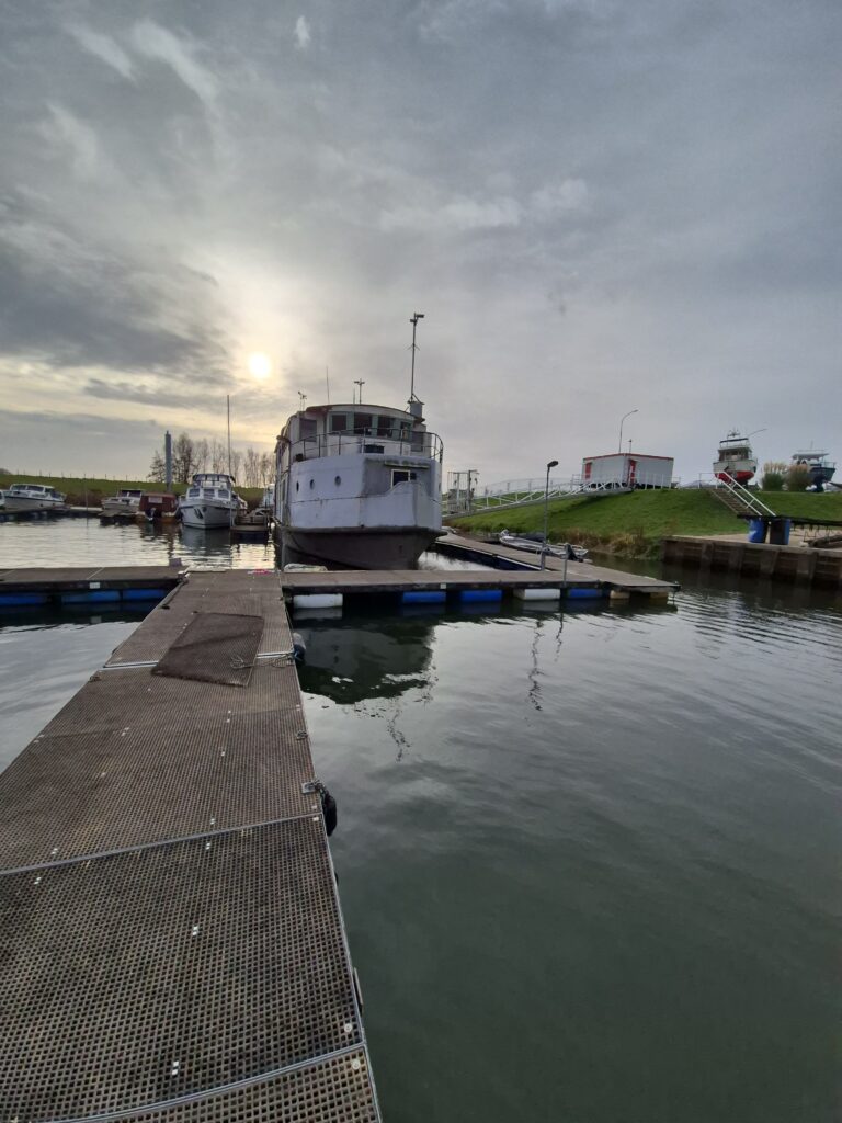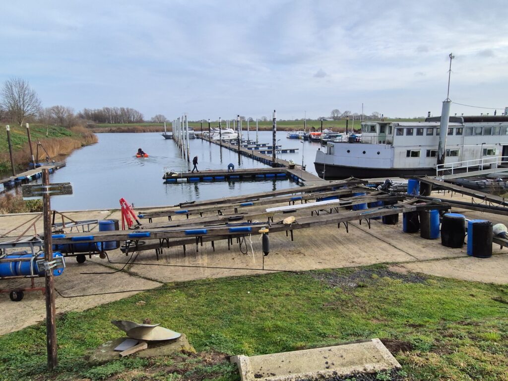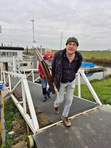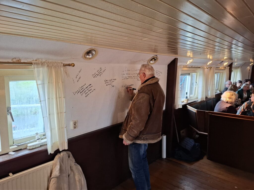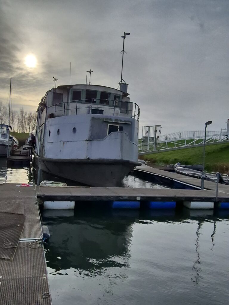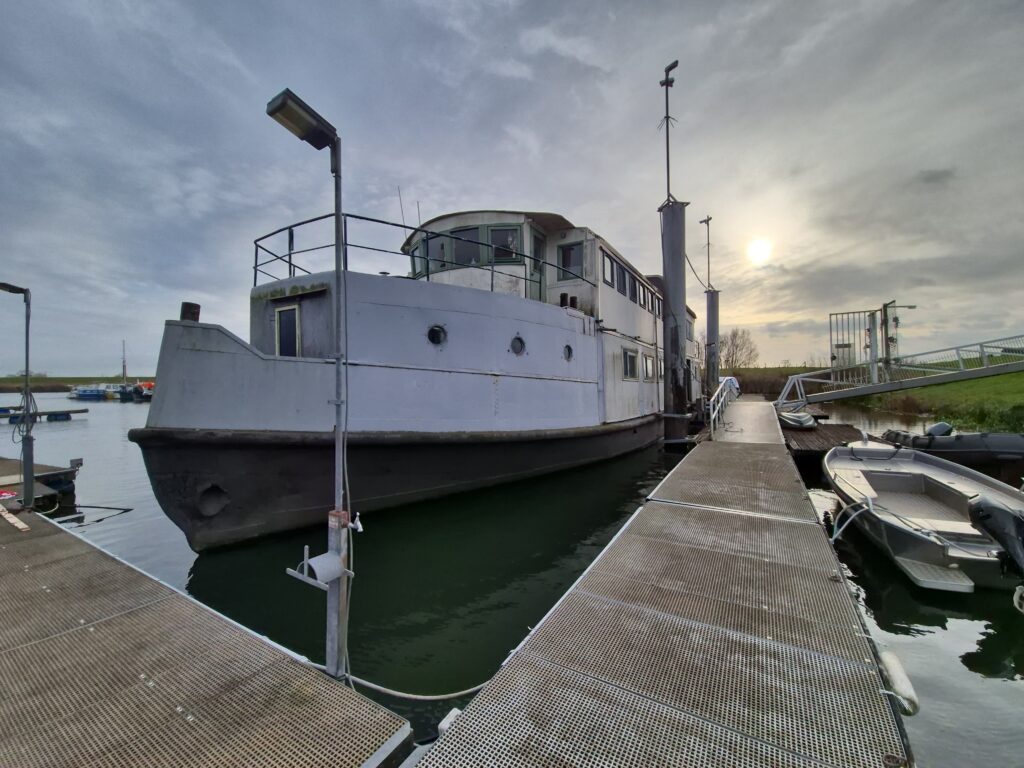 In 1996 werd het oude passagiersschip “KAAG” door onze vereniging aangekocht en verbouwd tot clubschip (klik voor de Historie). 29 jaar lang is zij onder de nieuwe naam “Dame Kaag” een gezellig en nuttig onderkomen geweest. In 2014 is ze nog voor groot onderhoud naar het droogdok van de Sepers Group in Heerewaarden geweest (klik voor de werfbeurt). Inmiddels was ze 78 jaar (gebouwd in 1947 in Dodewaard) en echt aan haar einde. De kosten van het onderhoud waren niet meer verantwoord en er waren vergunning problemen met Rijkswaterstaat. Na een ongeveer 10-jarige “strijd” met RWS en de gemeente om het verkrijgen van een bouwvergunning voor een nieuw clubhuis op de wal is die vergunning eind 2025 rond gekomen. Gedurende de maand december 2025 is door de groep vrijwilligers de Dame Kaag geheel leeggeruimd en losgekoppeld van gas, water en electra.