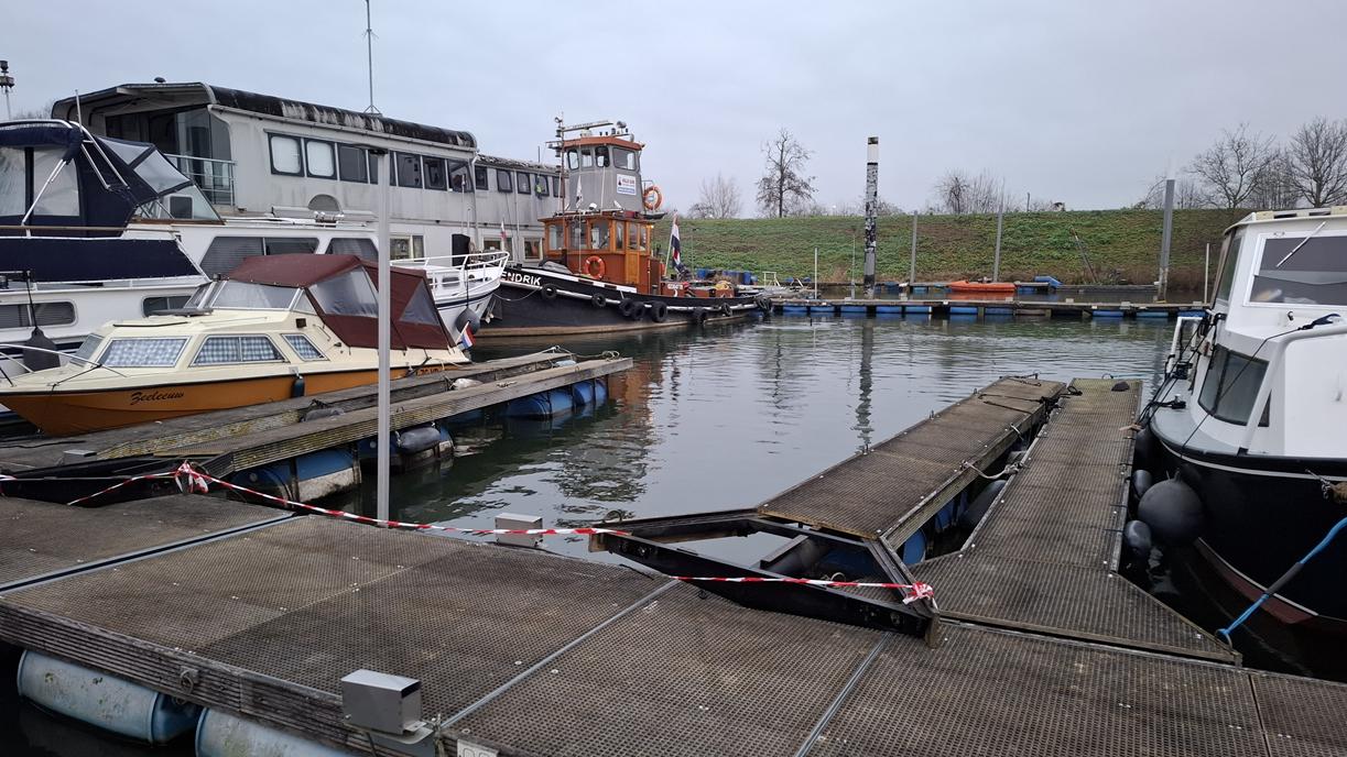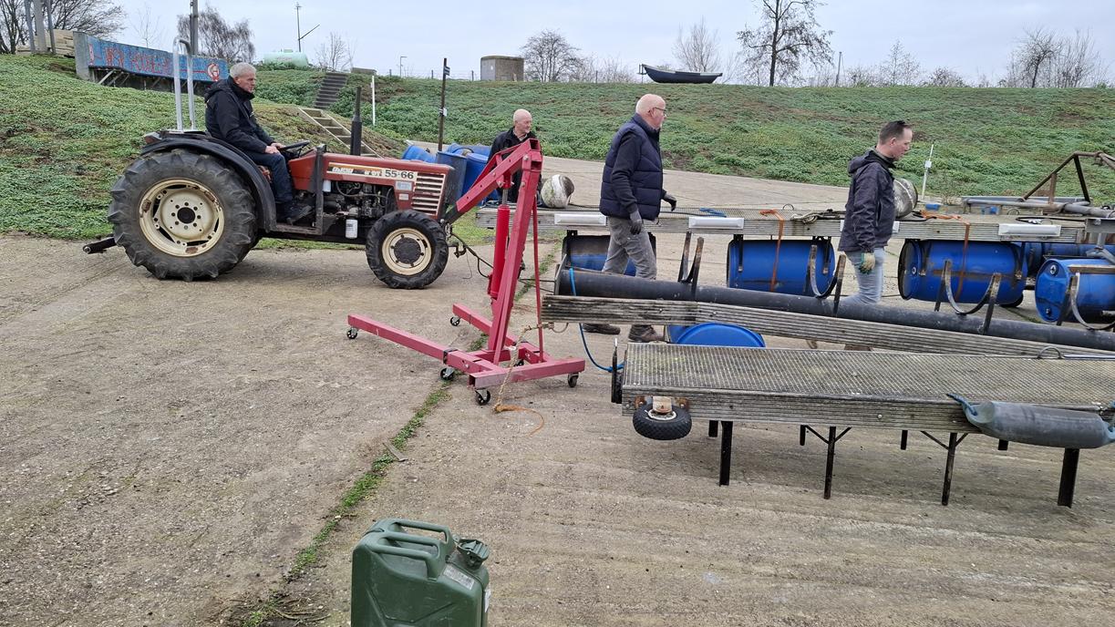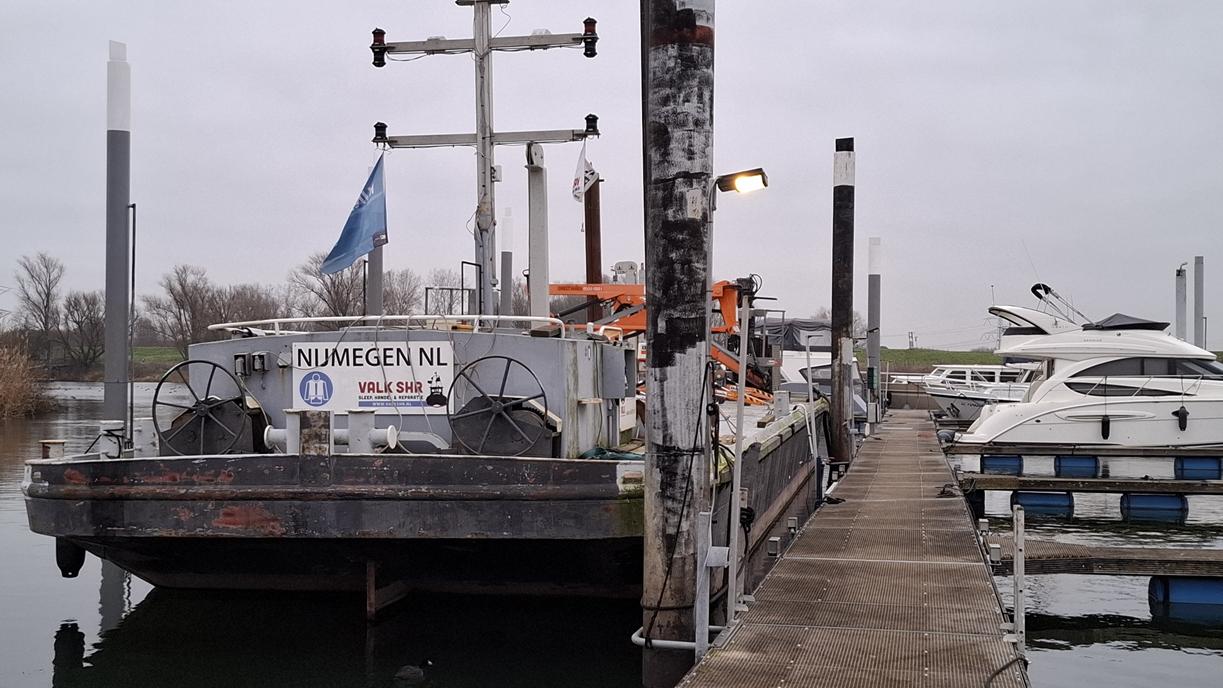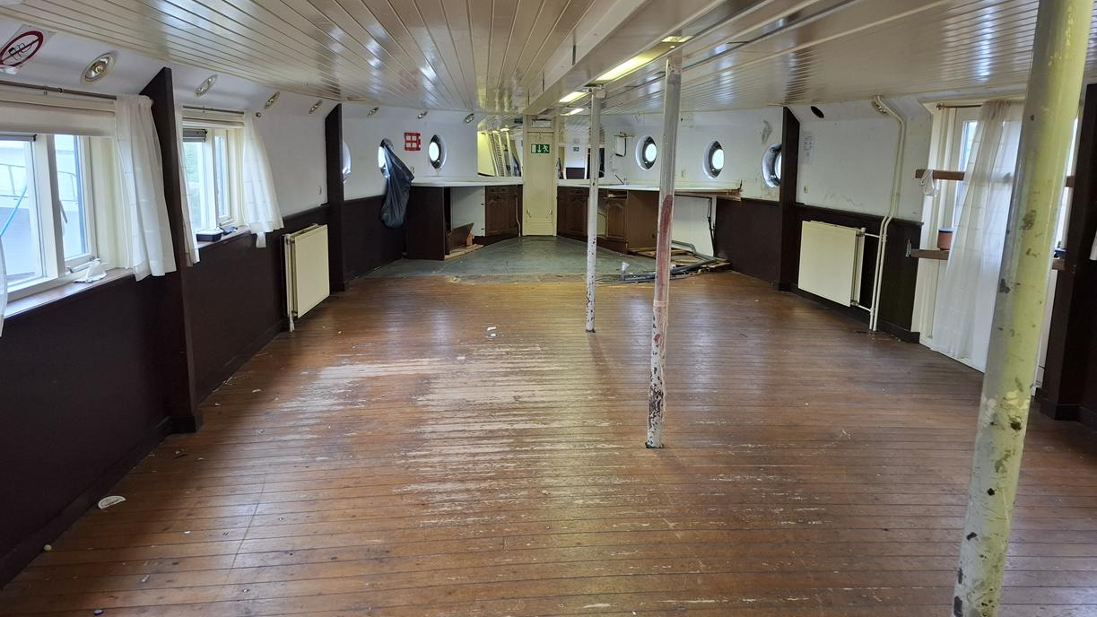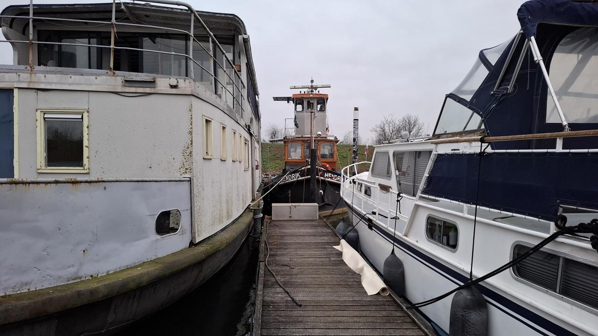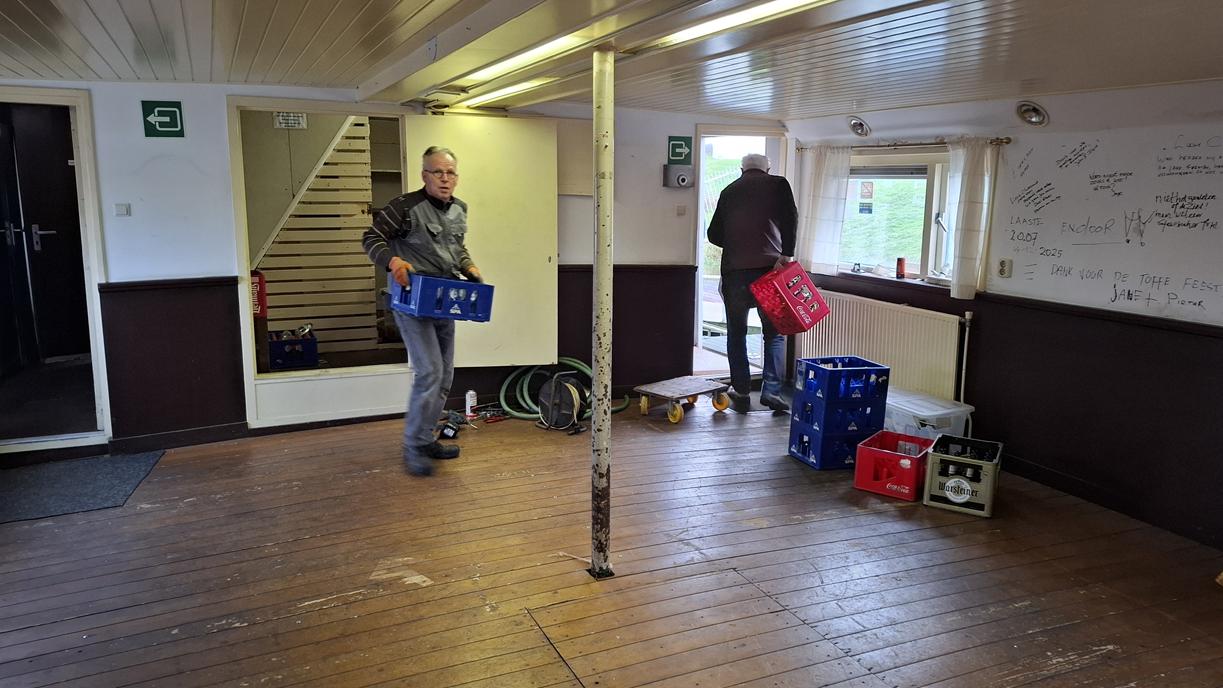 In 1996 werd het oude passagiersschip “KAAG” door onze vereniging aangekocht en verbouwd tot clubschip (klik voor de Historie). 29 jaar lang is zij onder de nieuwe naam “Dame Kaag” een gezellig en nuttig onderkomen geweest. In 2014 is ze nog voor groot onderhoud naar het droogdok van de Sepers Group in Heerewaarden geweest (klik voor de werfbeurt). Inmiddels was ze 78 jaar (gebouwd in 1947 in Dodewaard) en echt aan haar einde. De kosten van het onderhoud waren niet meer verantwoord en er waren vergunning problemen met Rijkswaterstaat. Na een ongeveer 10-jarige “strijd” met RWS en de gemeente om het verkrijgen van een bouwvergunning voor een nieuw clubhuis op de wal is die vergunning eind 2025 rond gekomen. Gedurende de maand december 2025 is door de groep vrijwilligers de Dame Kaag geheel leeggeruimd en losgekoppeld van gas, water en electra.