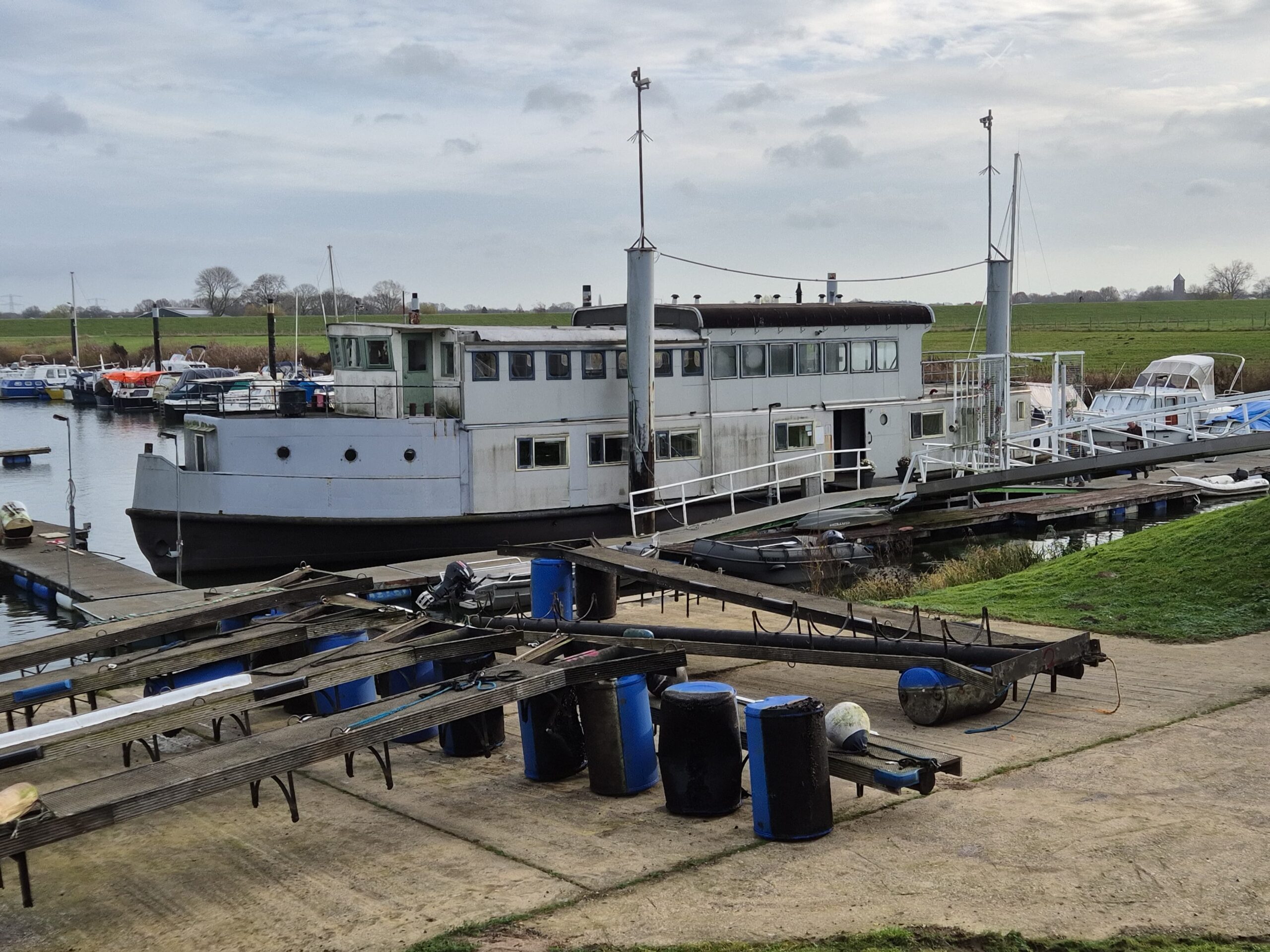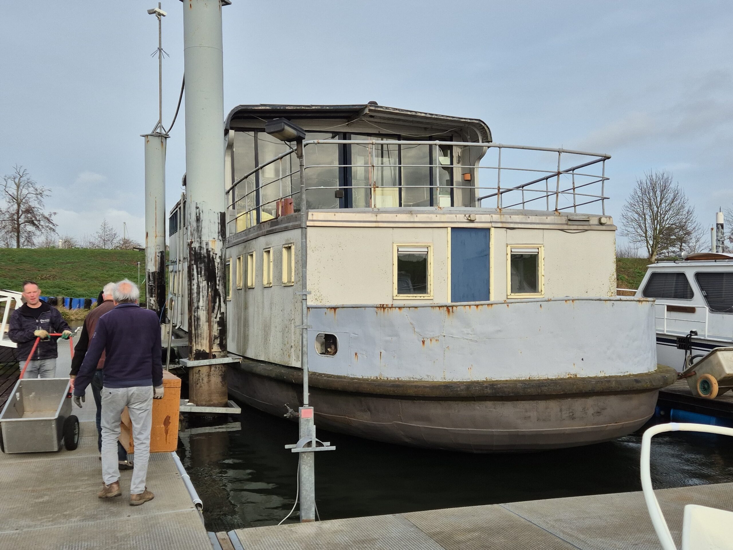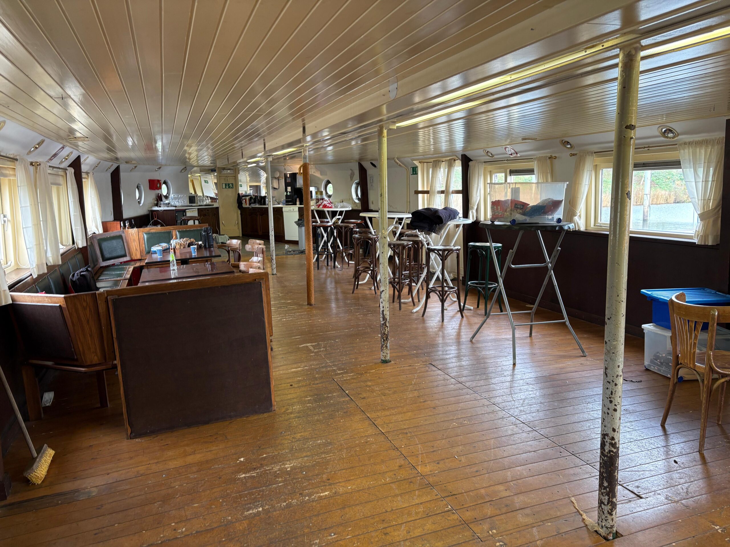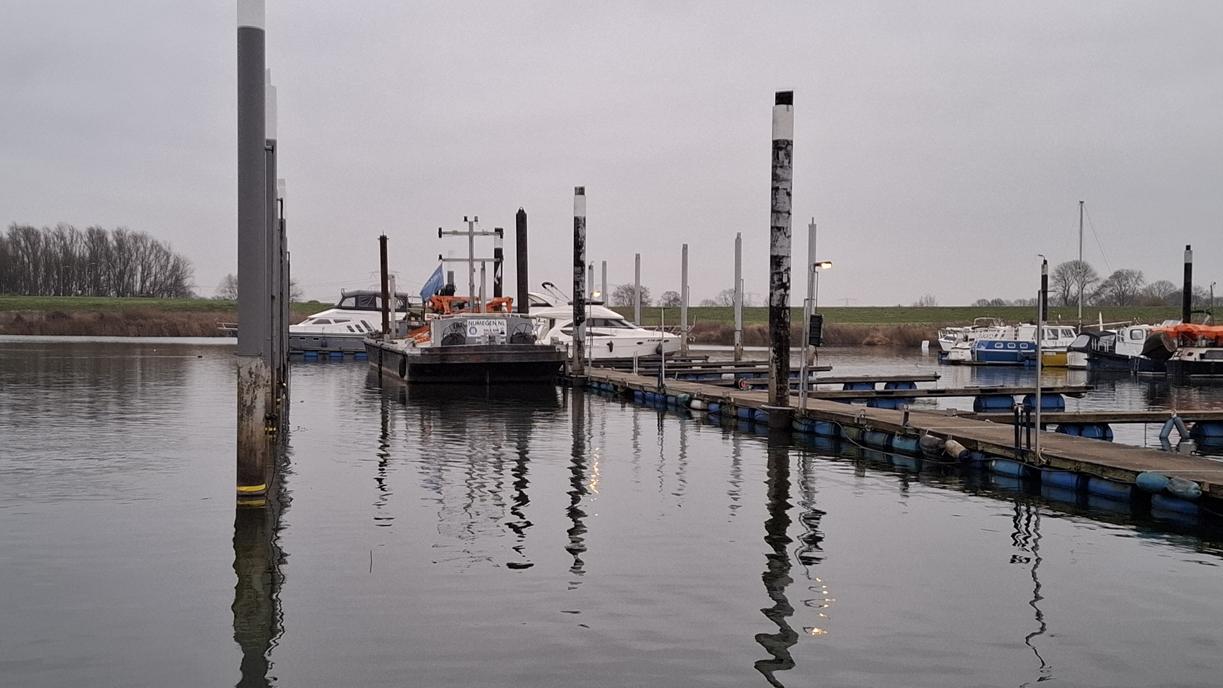 In 1996 werd het oude passagiersschip “KAAG” door onze vereniging aangekocht en verbouwd tot clubschip (klik voor de Historie). 29 jaar lang is zij onder de nieuwe naam “Dame Kaag” een gezellig en nuttig onderkomen geweest. In 2014 is ze nog voor groot onderhoud naar het droogdok van de Sepers Group in Heerewaarden geweest (klik voor de werfbeurt). Inmiddels was ze 78 jaar (gebouwd in 1947 in Dodewaard) en echt aan haar einde. De kosten van het onderhoud waren niet meer verantwoord en er waren vergunning problemen met Rijkswaterstaat. Na een ongeveer 10-jarige “strijd” met RWS en de gemeente om het verkrijgen van een bouwvergunning voor een nieuw clubhuis op de wal is die vergunning eind 2025 rond gekomen. Gedurende de maand december 2025 is door de groep vrijwilligers de Dame Kaag geheel leeggeruimd en losgekoppeld van gas, water en electra.