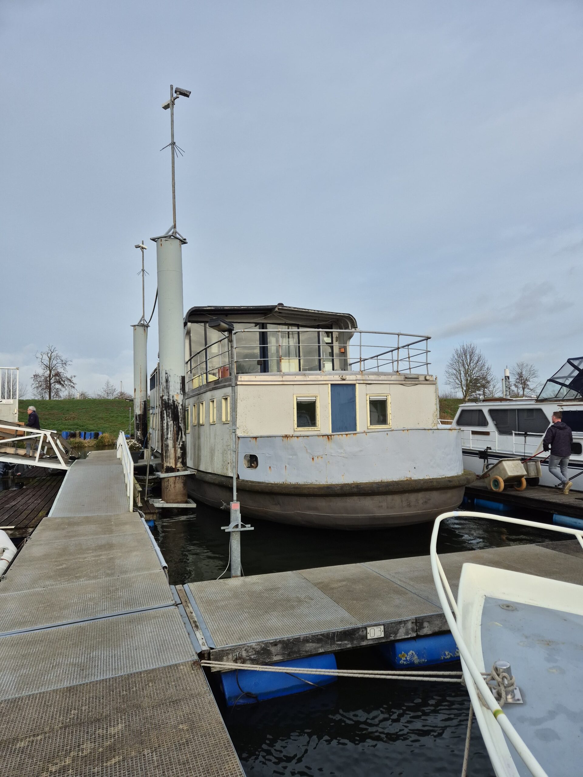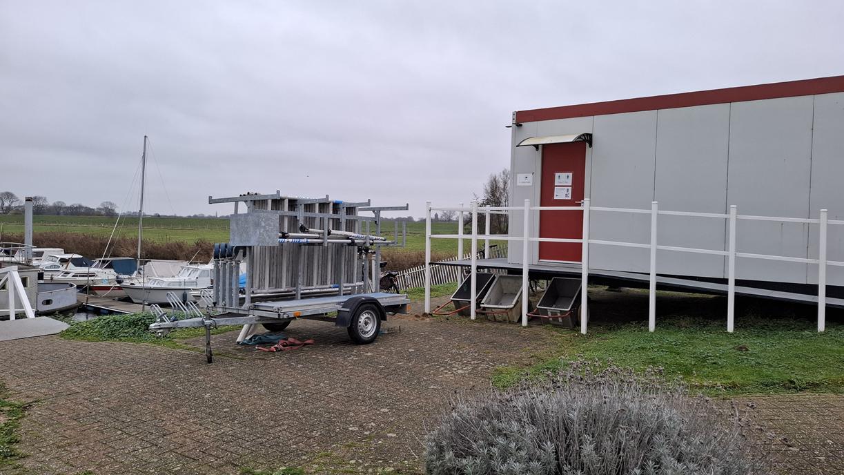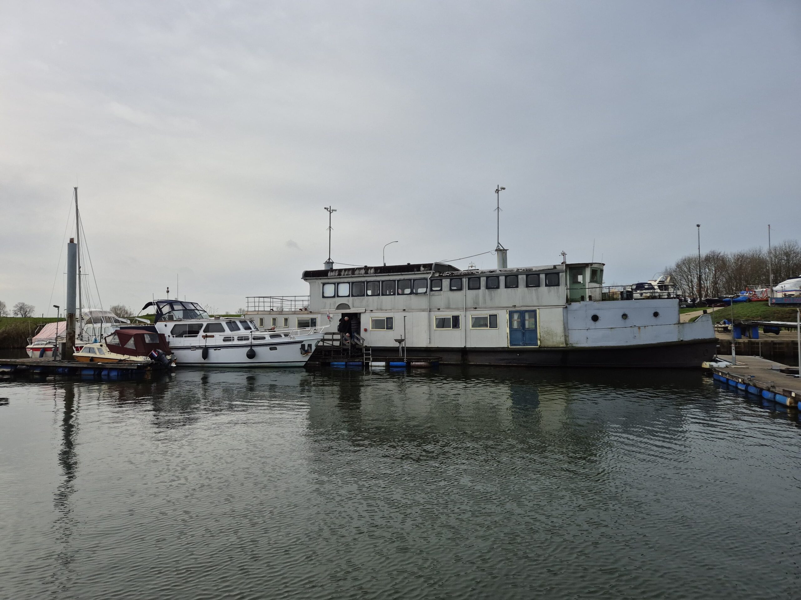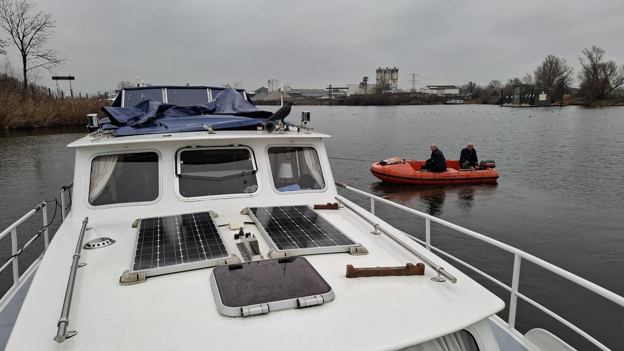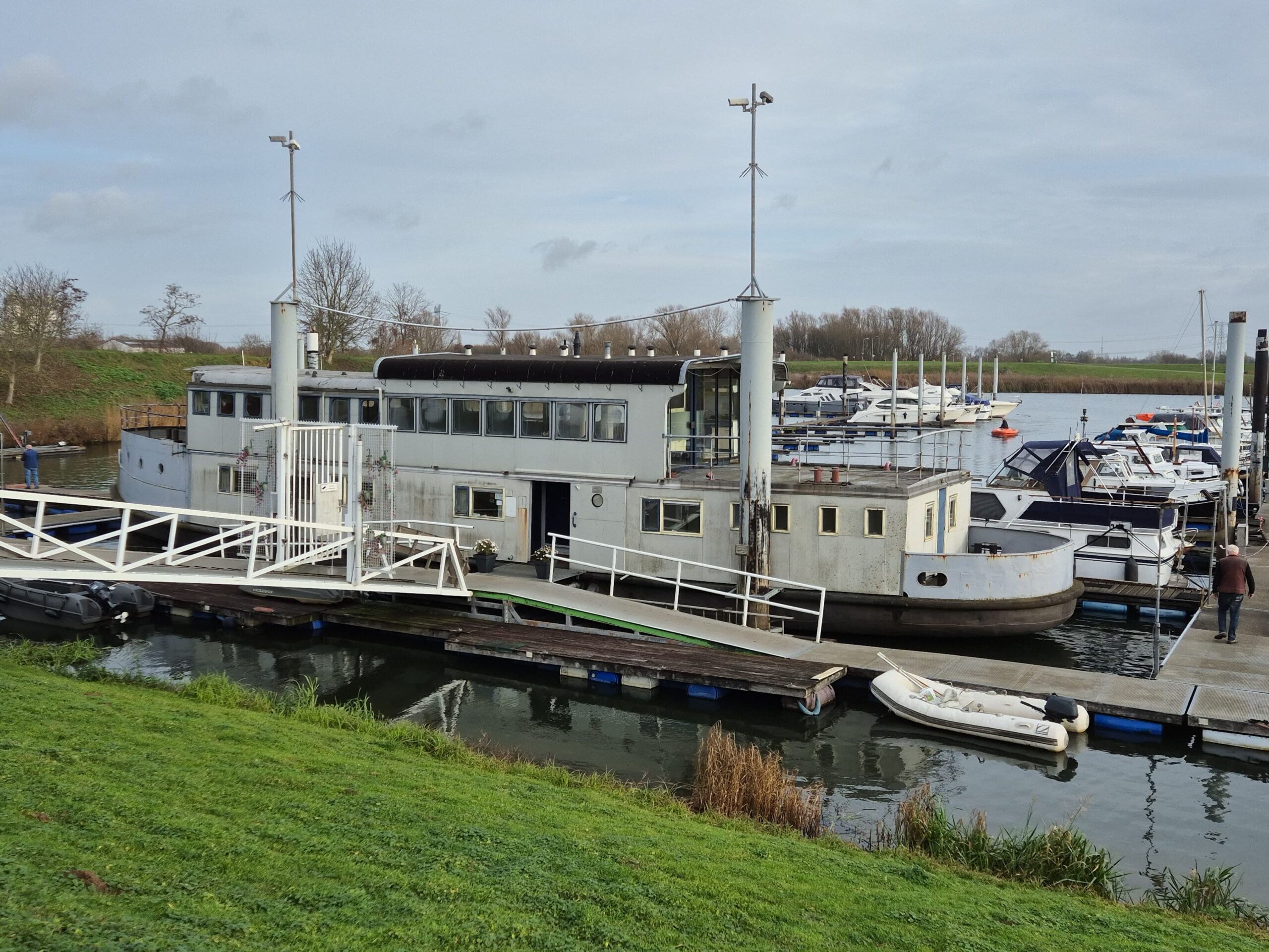 In 1996 werd het oude passagiersschip “KAAG” door onze vereniging aangekocht en verbouwd tot clubschip (klik voor de Historie). 29 jaar lang is zij onder de nieuwe naam “Dame Kaag” een gezellig en nuttig onderkomen geweest. In 2014 is ze nog voor groot onderhoud naar het droogdok van de Sepers Group in Heerewaarden geweest (klik voor de werfbeurt). Inmiddels was ze 78 jaar (gebouwd in 1947 in Dodewaard) en echt aan haar einde. De kosten van het onderhoud waren niet meer verantwoord en er waren vergunning problemen met Rijkswaterstaat. Na een ongeveer 10-jarige “strijd” met RWS en de gemeente om het verkrijgen van een bouwvergunning voor een nieuw clubhuis op de wal is die vergunning eind 2025 rond gekomen. Gedurende de maand december 2025 is door de groep vrijwilligers de Dame Kaag geheel leeggeruimd en losgekoppeld van gas, water en electra.