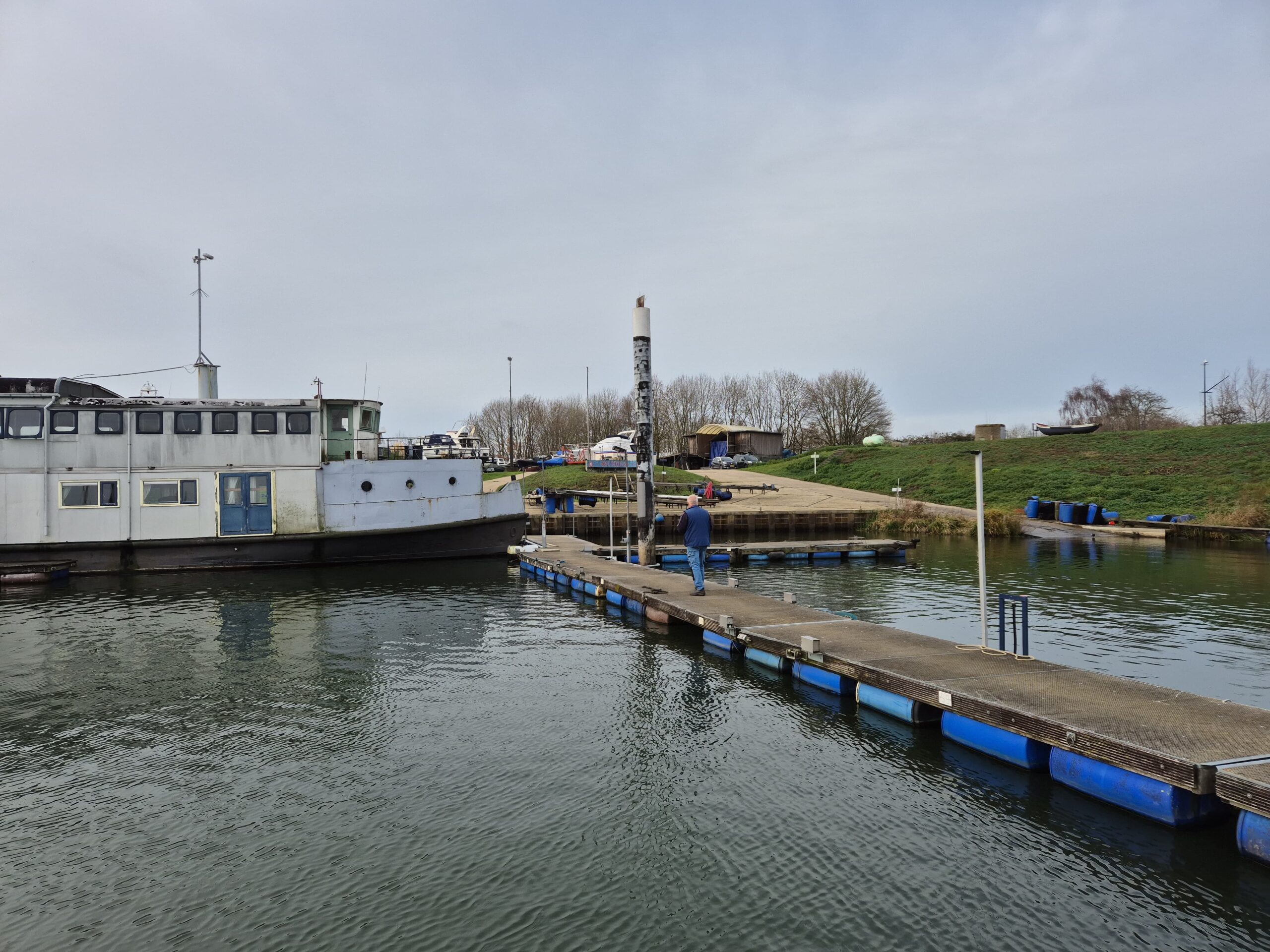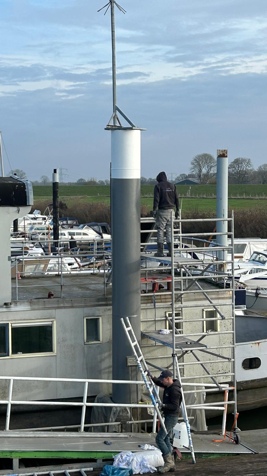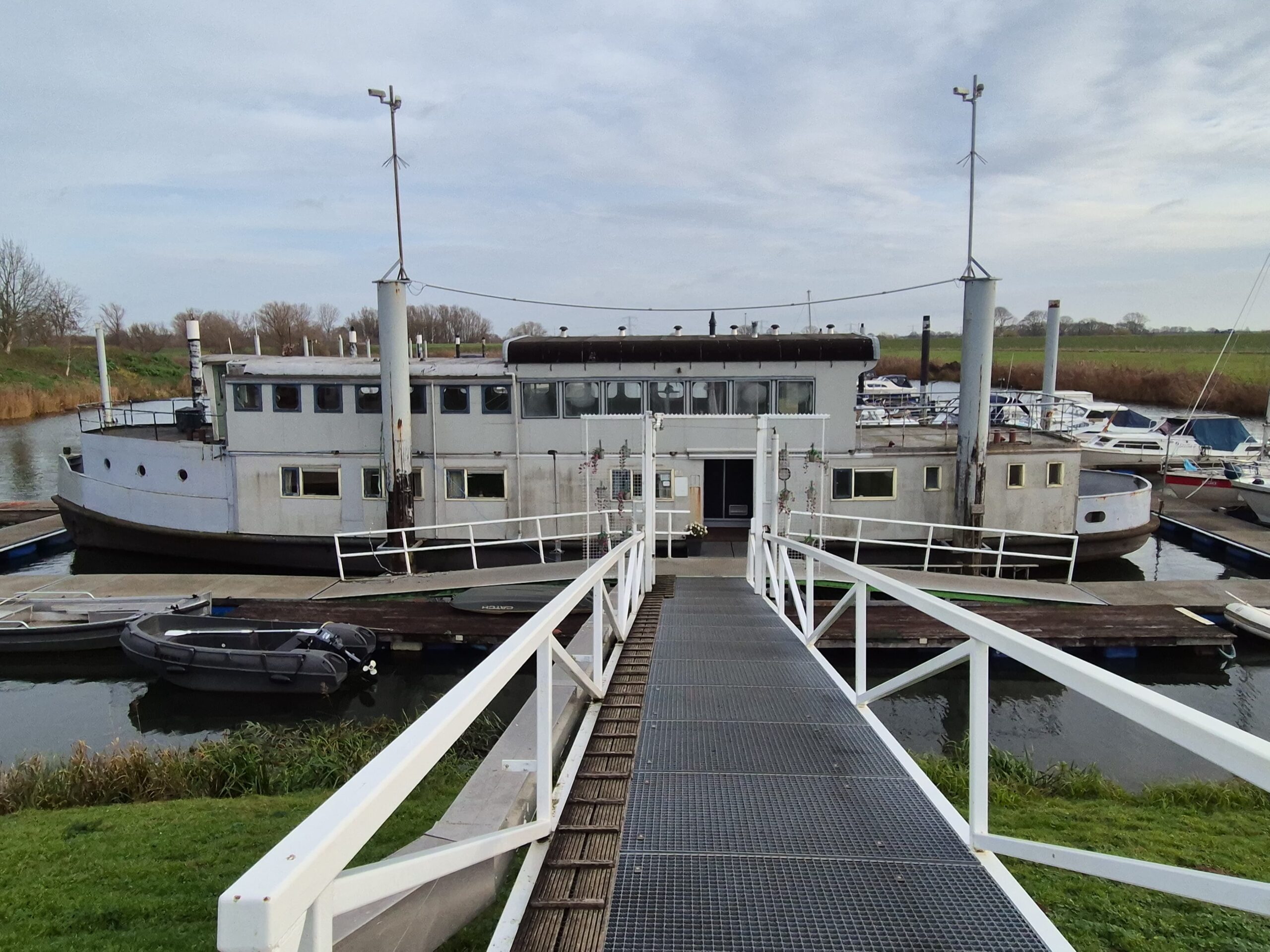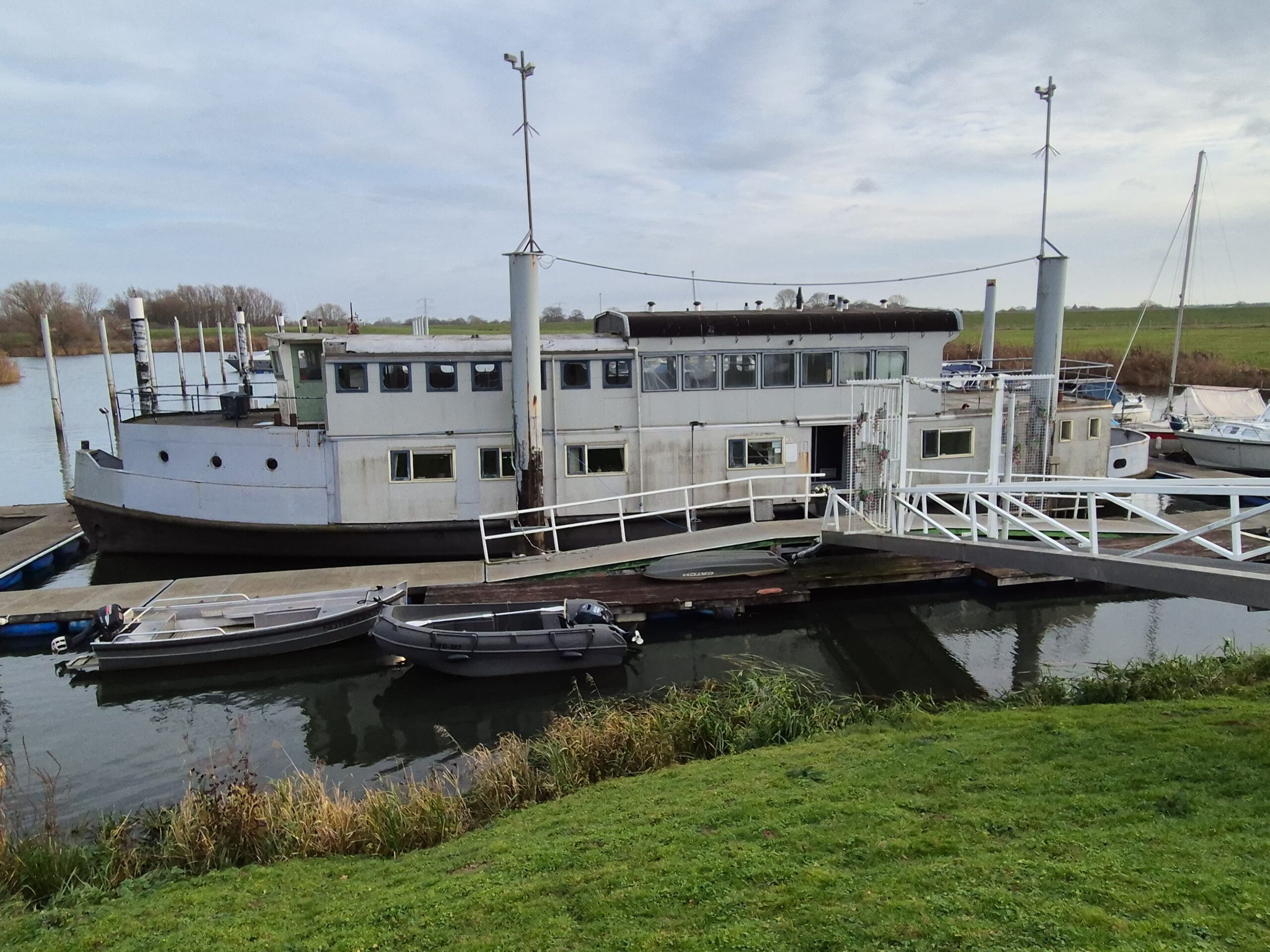 In 1996 werd het oude passagiersschip “KAAG” door onze vereniging aangekocht en verbouwd tot clubschip (klik voor de Historie). 29 jaar lang is zij onder de nieuwe naam “Dame Kaag” een gezellig en nuttig onderkomen geweest. In 2014 is ze nog voor groot onderhoud naar het droogdok van de Sepers Group in Heerewaarden geweest (klik voor de werfbeurt). Inmiddels was ze 78 jaar (gebouwd in 1947 in Dodewaard) en echt aan haar einde. De kosten van het onderhoud waren niet meer verantwoord en er waren vergunning problemen met Rijkswaterstaat. Na een ongeveer 10-jarige “strijd” met RWS en de gemeente om het verkrijgen van een bouwvergunning voor een nieuw clubhuis op de wal is die vergunning eind 2025 rond gekomen. Gedurende de maand december 2025 is door de groep vrijwilligers de Dame Kaag geheel leeggeruimd en losgekoppeld van gas, water en electra.